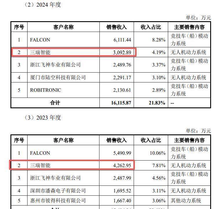 值得注意的是,公司前五大客户三瑞智能同时具备竞争对手身份,双方招股书披露的关联交易数据存在明显差异:好盈科技披露2023年、2024年向三瑞智能销售无人机动力系统金额分别为4262.95万元、3092.89万元,而三瑞智能披露同期从好盈科技采购电子调速器金额分别为4019.98万元、3386.19万元,两年份金额分别相差242.97万元、-293.3万元。这一数据差异未在双方招股书中得到合理说明,不仅反映出两家公司关联交易信息披露的严谨性不足,也对好盈科技IPO信息披露的准确性和完整性提出了疑问。