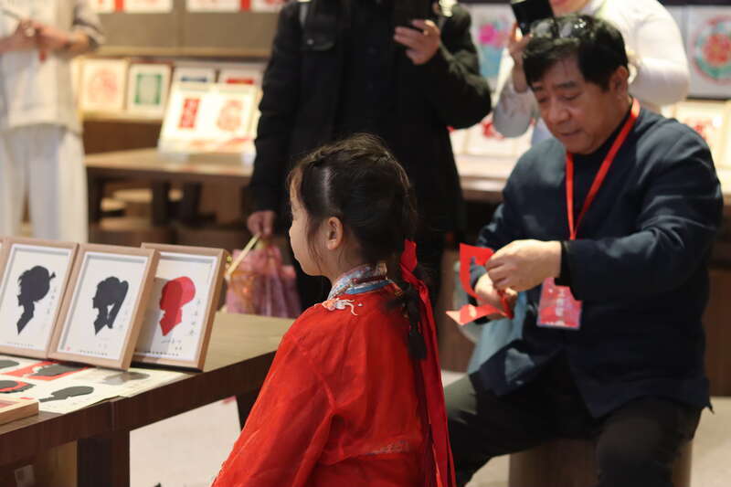 2月18日,北京,在中国工艺美术馆(中国非物质文化遗产馆)“气象万千——中国非遗保护实践主题展”现场,身穿汉服的小女孩体验剪影剪纸。中青报·中青网记者 余冰玥/摄