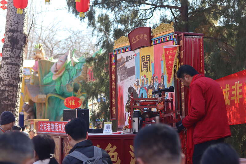 2月17日,北京,龙潭庙会上,游客观看拉洋片。拉洋片历史悠久,起源于宋代,清朝时由河北传入北京,成为老北京庙会上常见的文艺表演形式。拉洋片的道具是一个约两米高、一米宽的大木箱,大幅的彩色图画安装在木箱之后,木箱上有四个直径两厘米的圆形凸透镜镜片,箱子上安装锣鼓,由一条小绳控制。2008年,拉洋片被列入河北省非物质文化遗产名录。中青报·中青网记者 余冰玥/摄