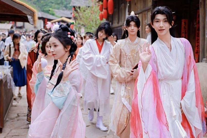 花朝节的高潮当属花朝大典。与传统演出不同,这场大典邀请每一位游客亲身参与。游客可提前进入“大明花阵”区域,与花神近距离互动、拍照留念。大典尾声,全场共同参与系红绸祈福仪式——将心愿写在红绸上,系于花枝间,让春风将美好祝愿带向远方。