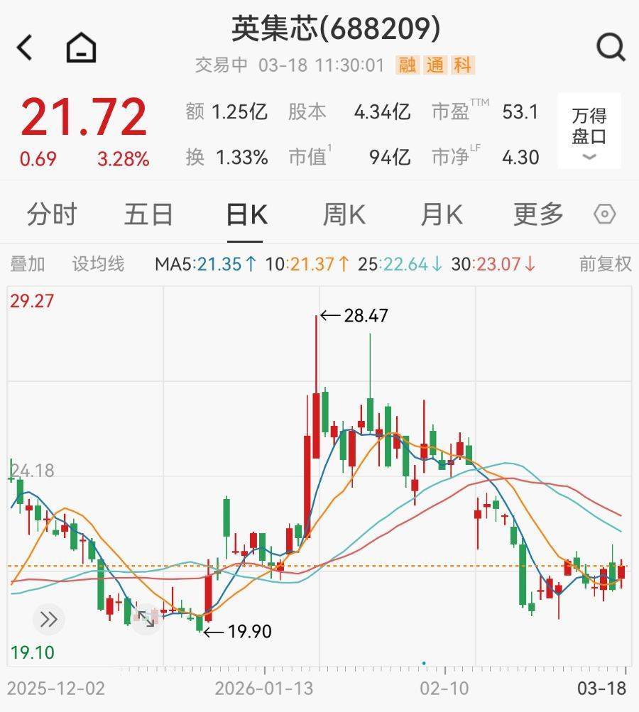 截至3月18日午间收盘,英集芯股价涨3.28%,报21.72元/股。